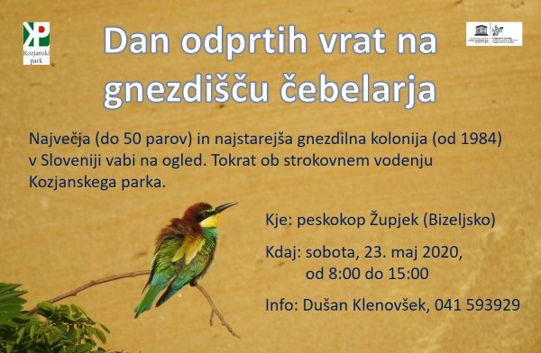Pisana ptica čebelar je ptica selivka, ki preživlja zimo v tropskem delu Afrike. V Sloveniji imajo te ptice gnezdišča ob rekah Reka in Mura, vidimo jih lahko tudi na Goričkem in v Vrbini pri Brežicah, največja gnezdišča pa so v Kozjanskem parku, kjer v soboto (23. maja) pod strokovnim vodstvom organizirajo »Dan odprtih vrat na gnezdišču čebelarja«. Čebelarji naj bi tu gnezdili od leta 1984. Te ptice gnezdijo v rovih, ki jih izkopljejo v stene in meseca junija pričnejo z valjenjem.
