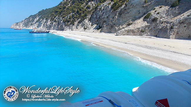Od daleč se je nato pod pečinami videl tanek bel pas, ki je ločeval morje od pečin in je sčasoma postajal čedalje bolj viden, morje pa je dobivalo lepšo in lepšo barvo, prelivajočo v turkiznih odtenkih. Približali smo se obali in pred nami je bila plaža imenovana Egremni beach…![]()