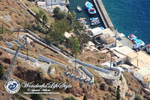 Tik pod mestecem Fira se nahaja pristanišče Old port , do katerega je speljana zavita pot z malo manj kot 600 stopnicami, po katerih se lahko z veliko truda odpravite tudi peš, lahko pa si olajšate pot s taxi-oslom. Najkrajša pot je vsekakor z gondola (cable car), ki vas pripelje v treh minutah.