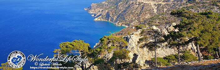 Cesta obkrožena z živo zelenimi borovci, ponekod tudi s starimi oljkami, se je ves čas držala pobočja in vijugala ob barvitih skalah, razgled pa se je ponekod razširil v globine vse do obalnega dela morja, na nekaterih točkah se je videl velik del vzhodnega dela otoka Karpathos, vožnja je potekala namreč visoko nad morjem.